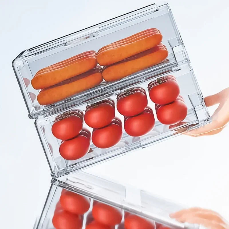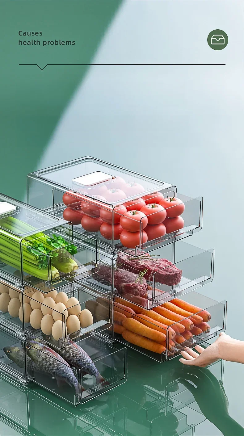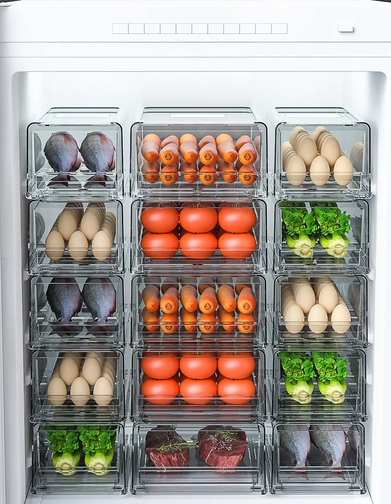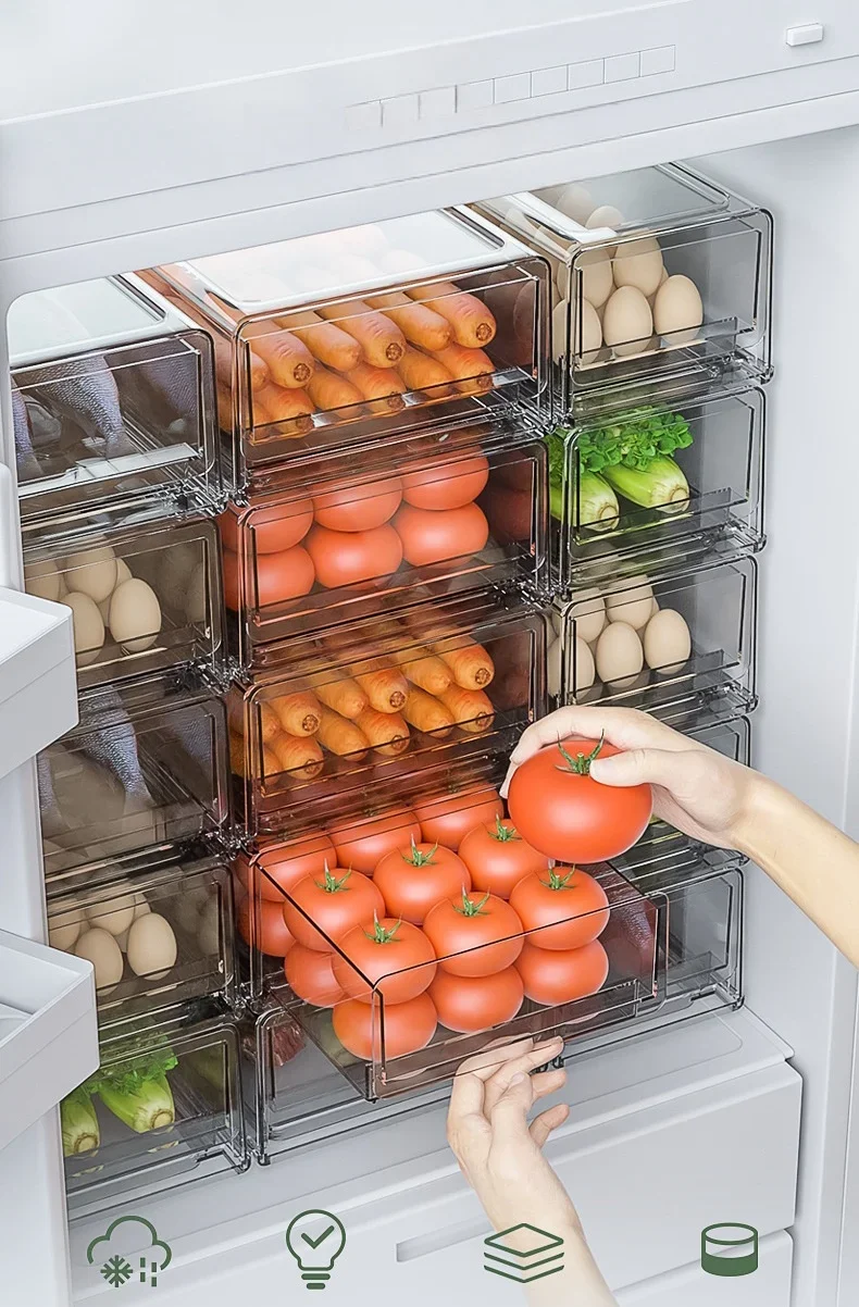 Short Description: Organize your fridge with this stackable, food-grade BPA-free storage box, perfect for vegetables, fruits, and other kitchen supplies.